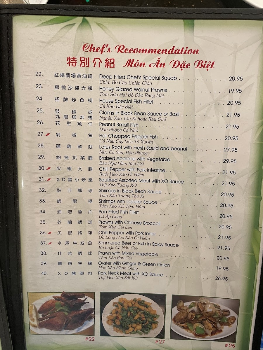 Live Seafood selections are available, including steamed oysters, lobster, and crab, catering to those seeking fresh seafood offerings.