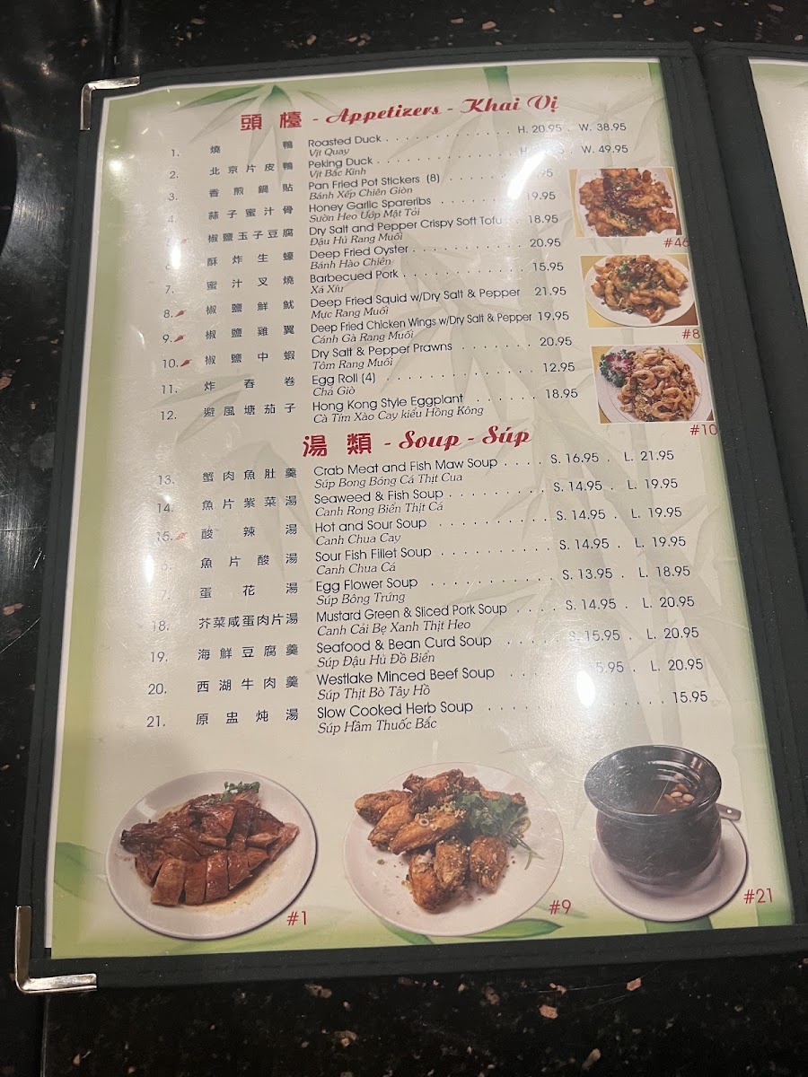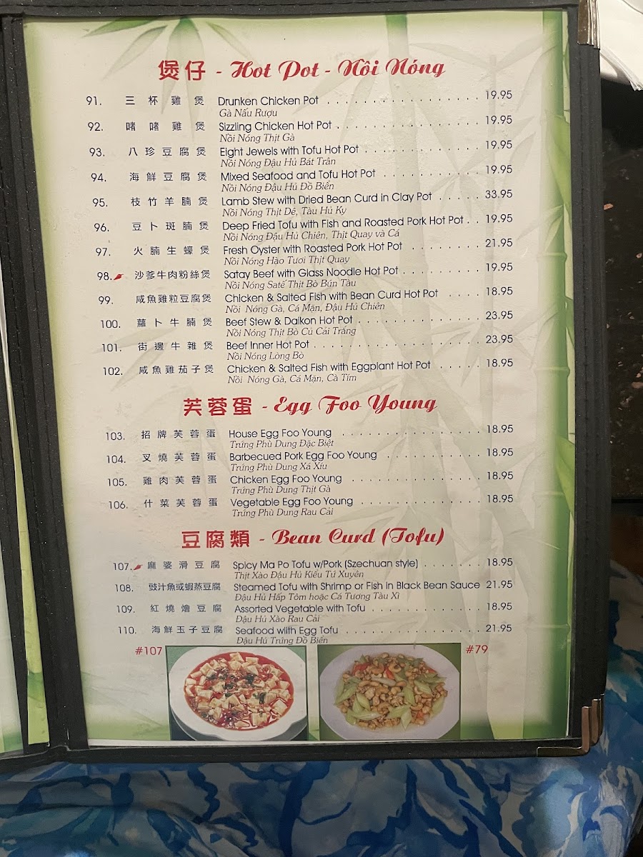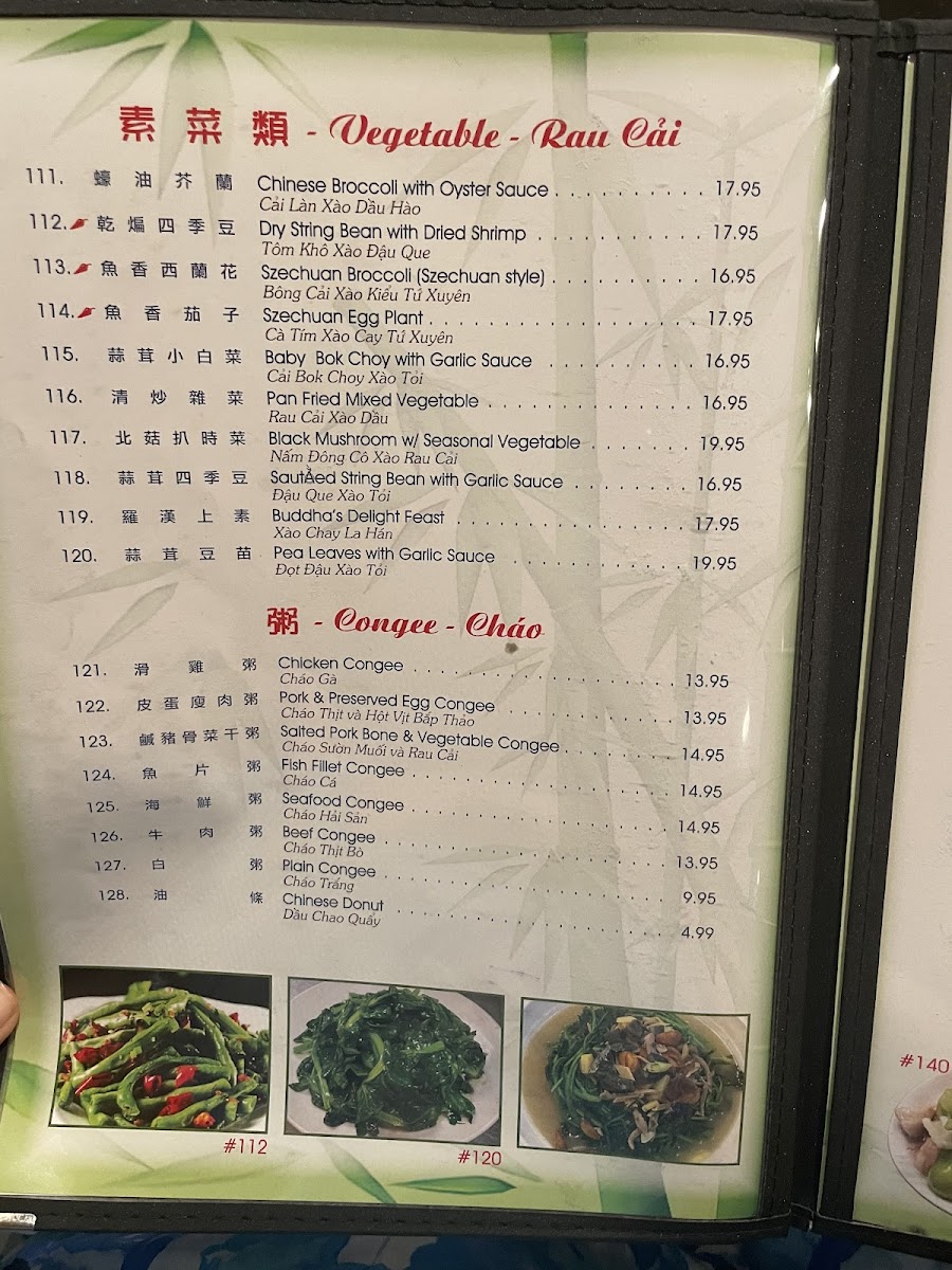 The menu features a broad selection of traditional Chinese dishes, structured into several key categories to accommodate a variety of dining preferences.