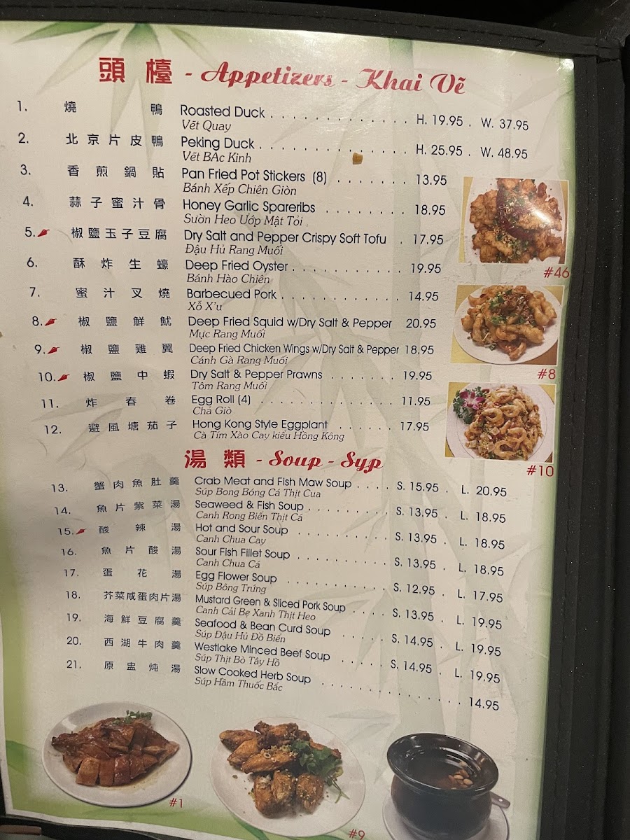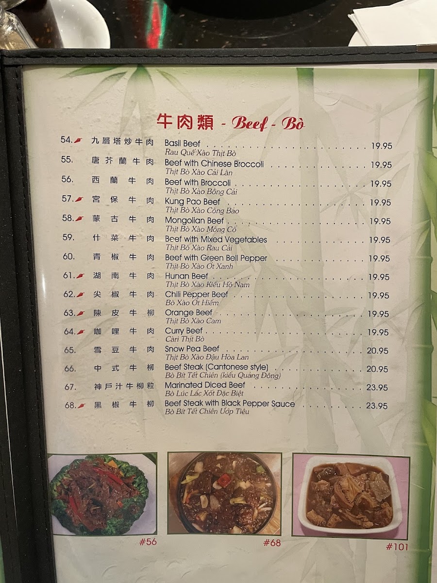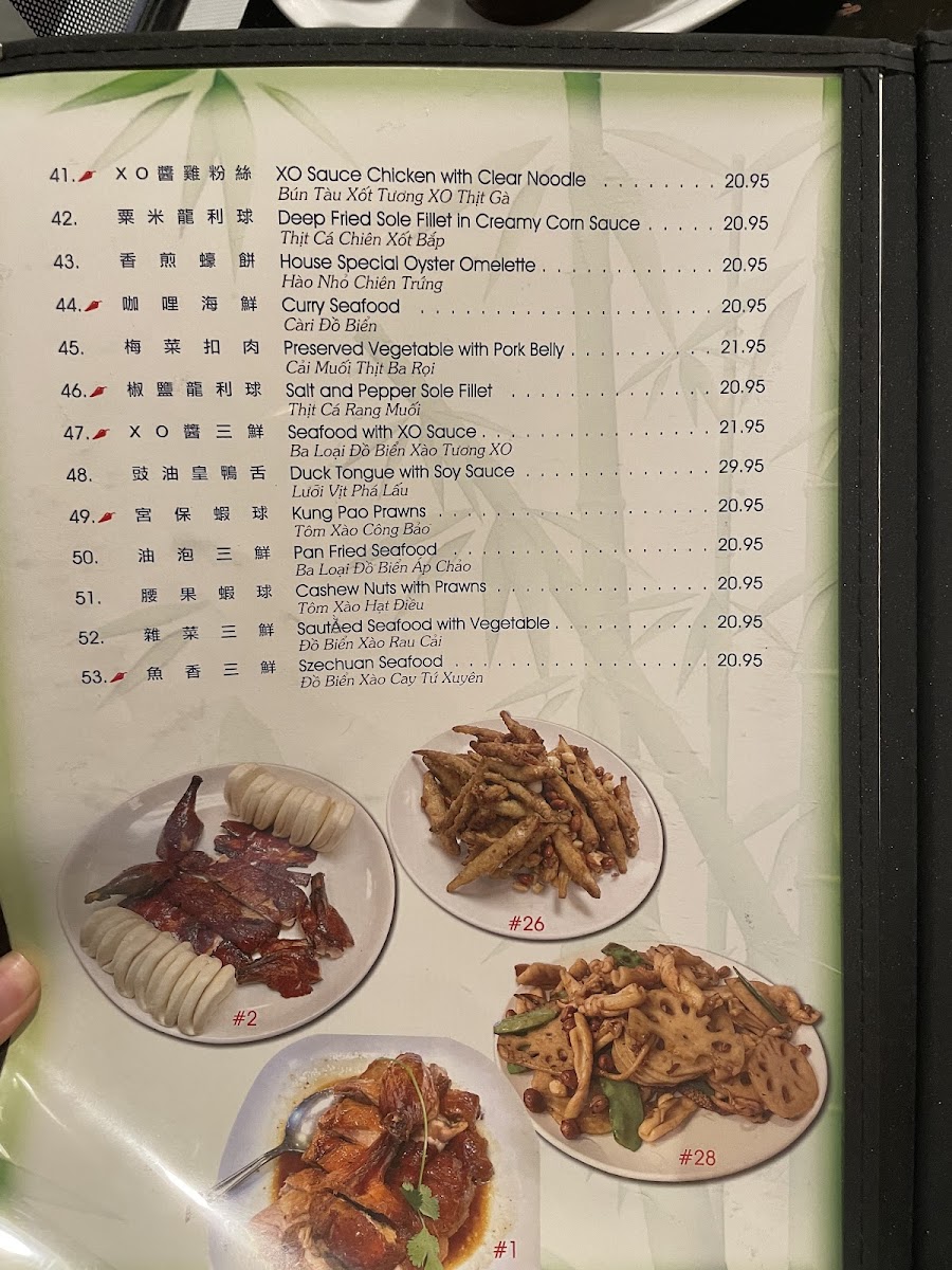 The menu features a broad selection of traditional Chinese dishes, structured into several key categories to accommodate a variety of dining preferences.